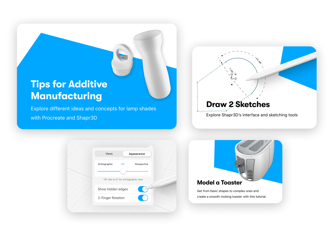 Forget lengthy CAD trainings. Video tutorials tailored to your needs and an Apple Design Award winning user interface will help you become productive in 5-10 hours.
